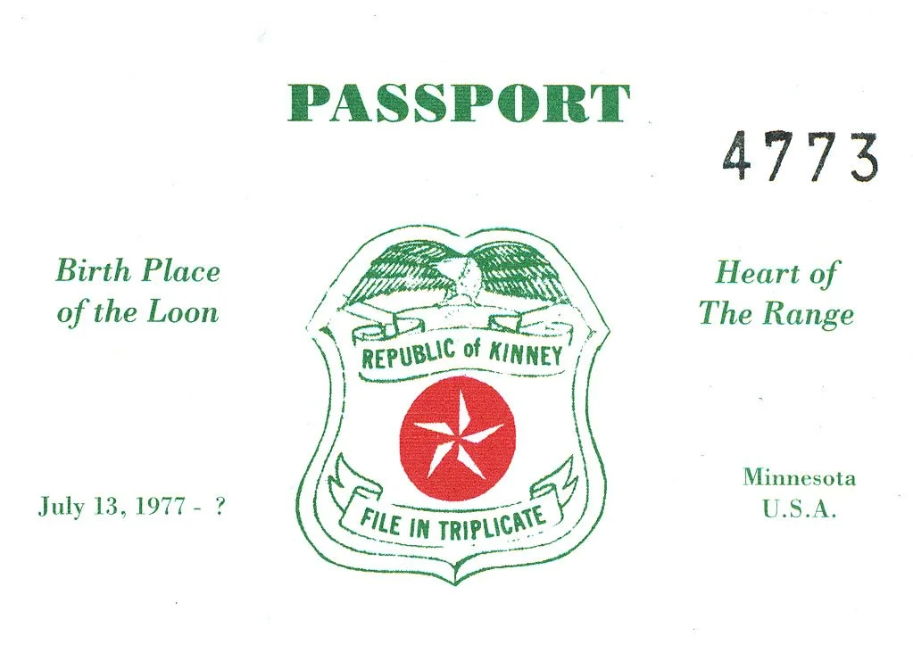 Phones at city hall and at Mary’s Bar began ringing. By summer, tourists were dropping by, some from overseas. Someone suggested passports, so Randall designed a shield with Kinney’s national motto — “FILE IN TRIPLICATE.” Local schools held a flag design contest. Some residents changed their addresses to Republic of Kinney 55758. When a local gave the town a canoe, it became the republic’s navy.
