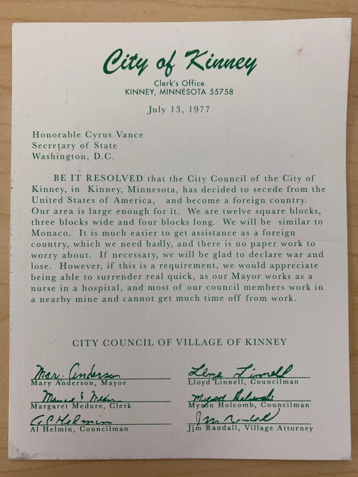 BE IT RESOLVED that the City Council of the City of Kinney, in Kinney, Minnesota, has decided to secede from the United States of America, and become a foreign country. Our area is large enough for it. We are twelve square blocks, three blocks wide and four blocks long. We will be similar to Monaco. . .