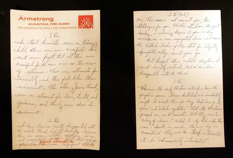Writing on note paper left by his lawyer, then when it runs out, on toilet paper, King continues. “Letter from a Birmingham Jail” runs to 20 pages. King explains just and unjust laws and weighs in on time and history.