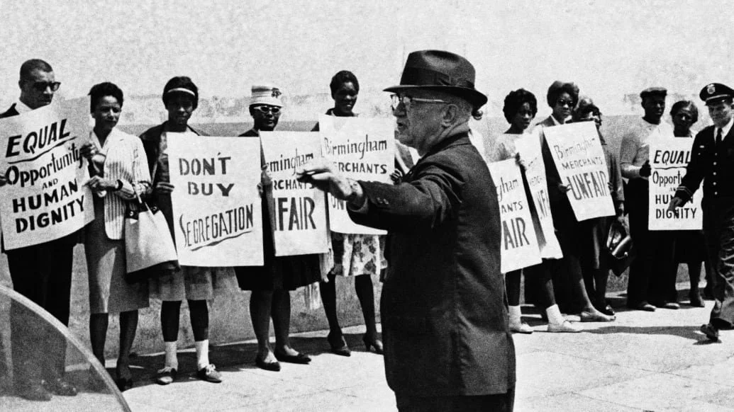 Arriving in Birmingham, King helps revive a boycott. But “Bull” Connor, the city’s safety commissioner and most blatant bigot, gets a court injunction banning “parading, demonstrating, boycotting, trespassing and picketing.” King has obeyed injunctions elsewhere and seen protests wither. No more. The marches, the boycott continue.
