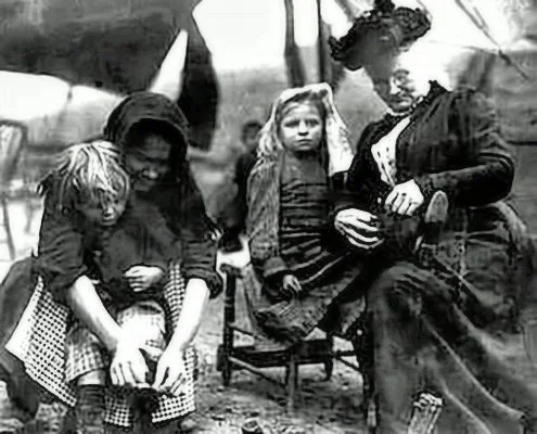 A white-haired woman in a black dress stands at a podium. She calls a few children to join her. They scramble up steps and face the crowd. But are these children? All are worn down, a pack of defeated waifs “from whom all the childhood had gone.” At the woman’s request, some hold up hands to show missing fingers, mangled limbs.