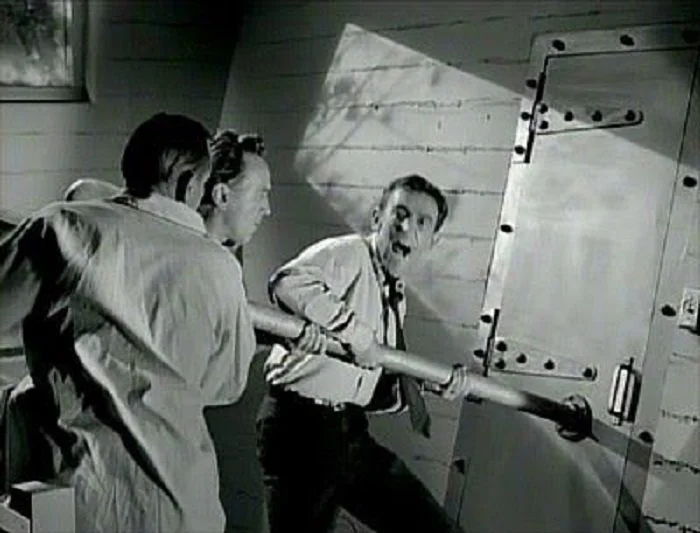 Dr. Bill Stockton’s birthday party is cut short by an air-raid siren. Families scurry into the night, but Stockton has a “bomb shelter.” Safe inside, he hears neighbors pounding, demanding to be let in. The “nightmare” unfolds as neighbor turns on neighbor. Finally, another siren. All clear. Life can go back to normal. But after such raw ugliness, will it? Cut to voiceover. . .