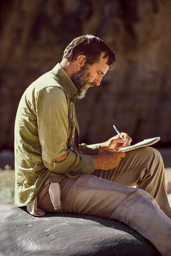 Wearied by another encounter with “industrial tourism,” the ranger returns to sweet solitude. A campfire, some whiskey, and his trailer’s view of the vast canyonlands and spangled sky. After savoring it all, he pulls out a journal and jots a few notes.